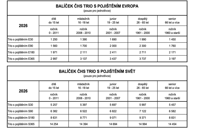 Balíček ČHS Trio přináší spolehlivé celoroční cestovní pojištění, slevy na ubytování v alpských chatách a členské výhody Českého horolezeckého svazu. Cena pro jednotlivce se odvíjí od věku člena a vybraného tarifu pojištění (Evropa/Svět/délka souvislého pobytu v zahraničí). Pojistné limity a další parametry pojištění jsou u všech tarifů stejné. S dětmi do 18 let je výhodnější rodinný balíček (mohou být max. čtyři děti).