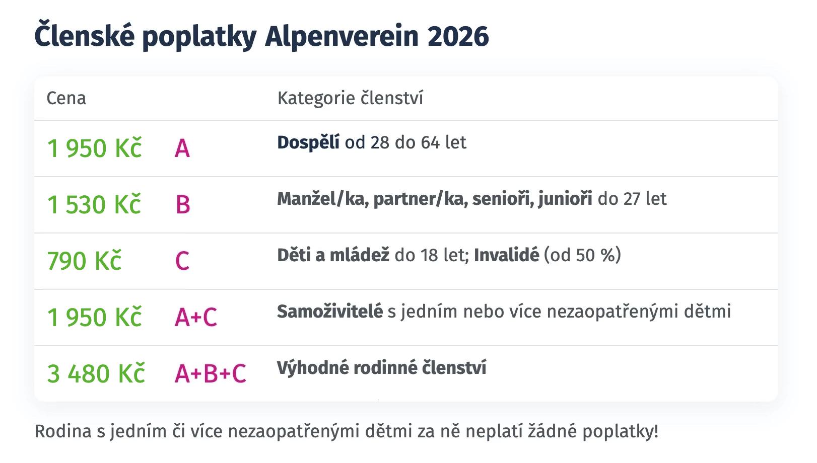 Úhradou členských poplatků Alpenvereinu získáváte i celoroční pojištění Alpenverein Weltweit Service, které kryje rizika při provozování sportovních aktivit na celém světě. Jste tak pojištěni pro veškeré volnočasové, sportovní i outdoorové aktivity, při své dovolené či na služebních cestách (pozor na výjimky), včetně případné repatriace. Jsou-li členy Alpenvereinu oba rodiče, získávají jejich děti do 18 let (studenti do 27 let) členství, a tedy i pojištění zdarma!